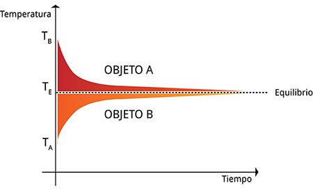 Ya mencionamos que el calor sigue un sentido determinado: desde el cuerpo de mayor temperatura a otro de menor. La transferencia de energía entre dos cuerpos se produce hasta que se alcance el equilibrio térmico, es decir, hasta que ambos tengan la misma temperatura.